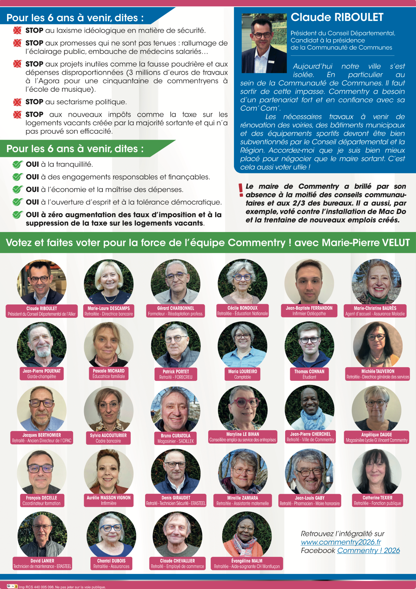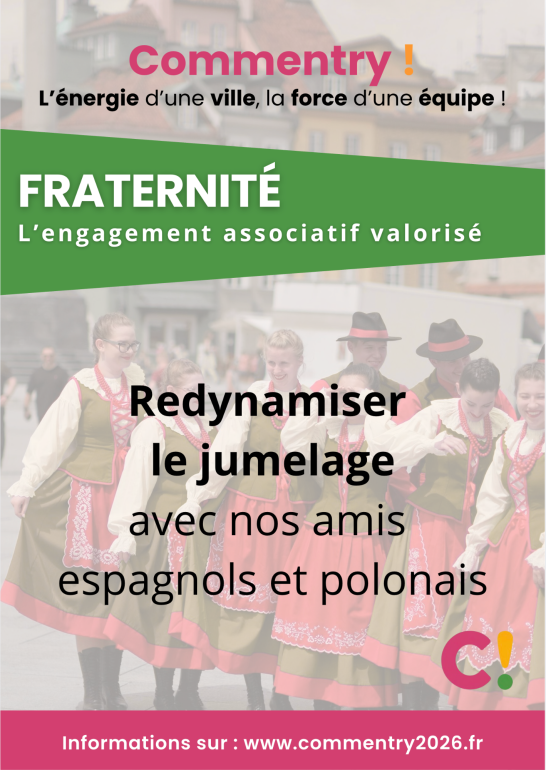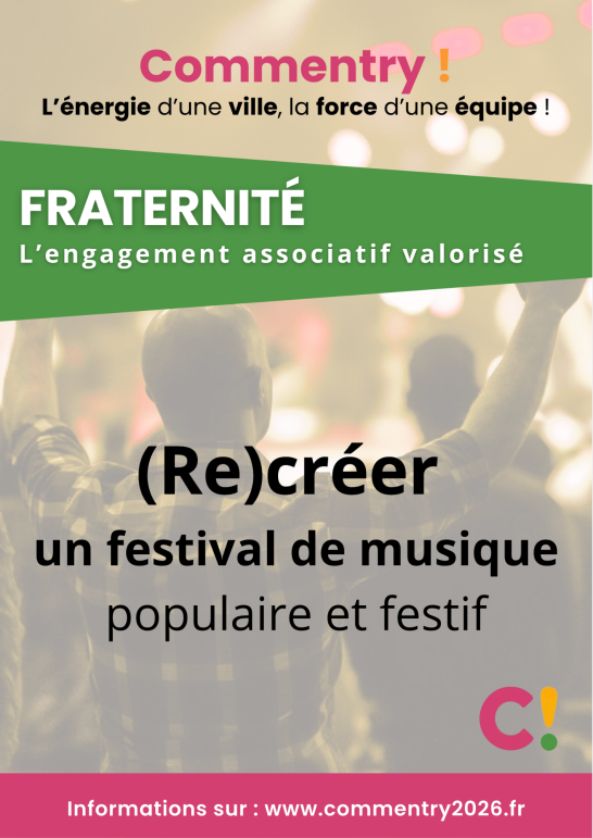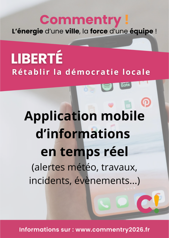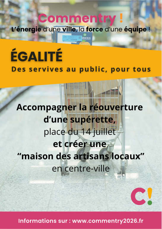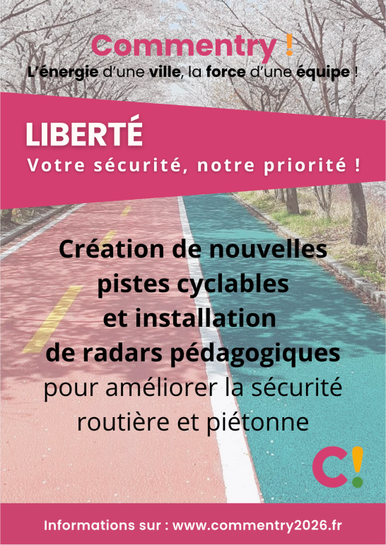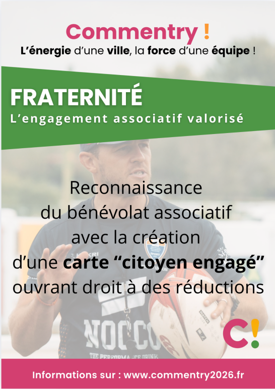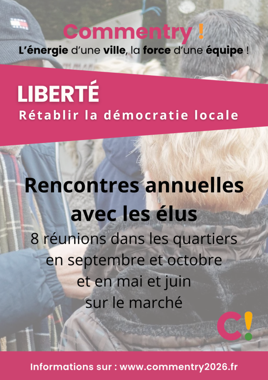 Nos propositions concrètes et mesurables pour la sécurité, le cadre et la qualité de vie, l'action sociale et solidaire, l'école, les commerces et le coeur de ville, la culture, le sport, l’environnement, la jeunesse, les seniors, le soutien aux entreprises... Un programme réaliste élaboré avec et pour les Commentryens à l'occasion des consultations dans les quartiers.