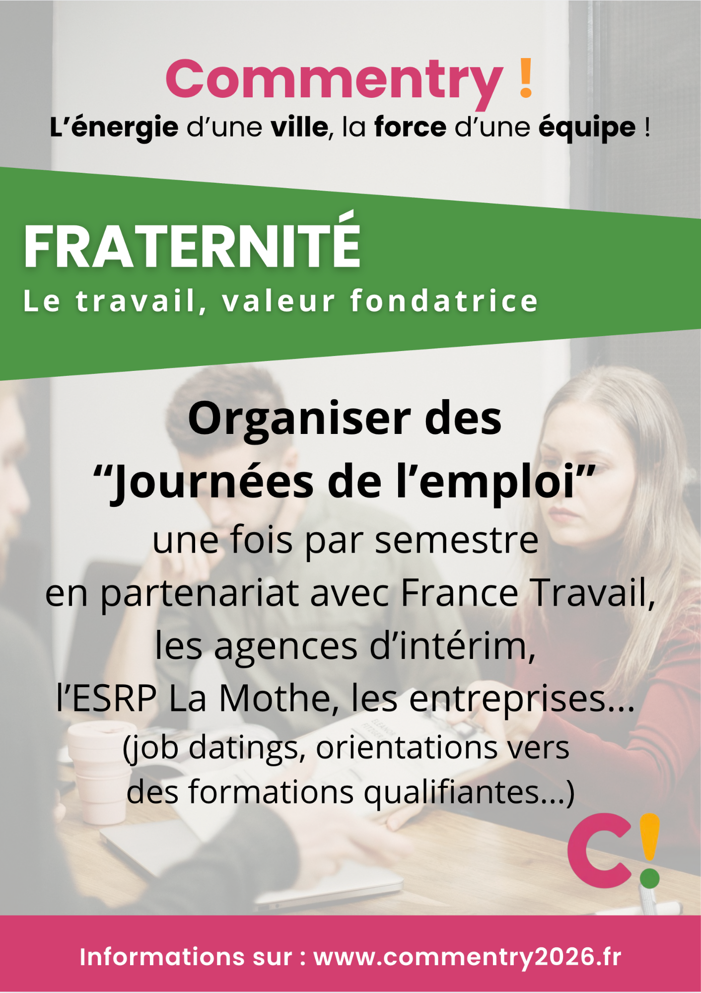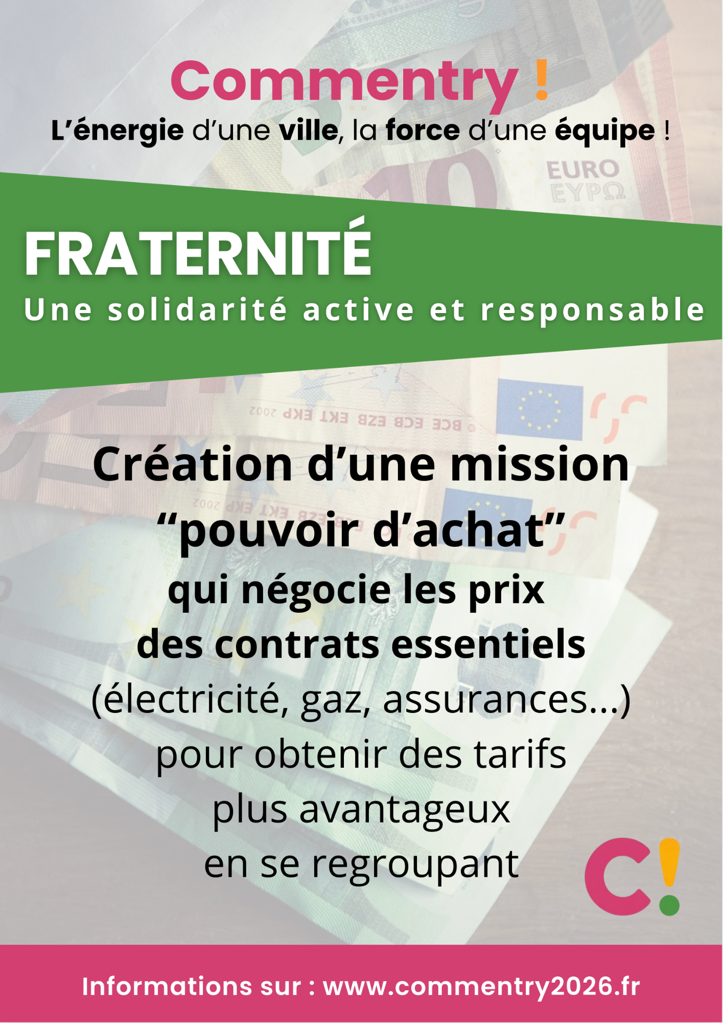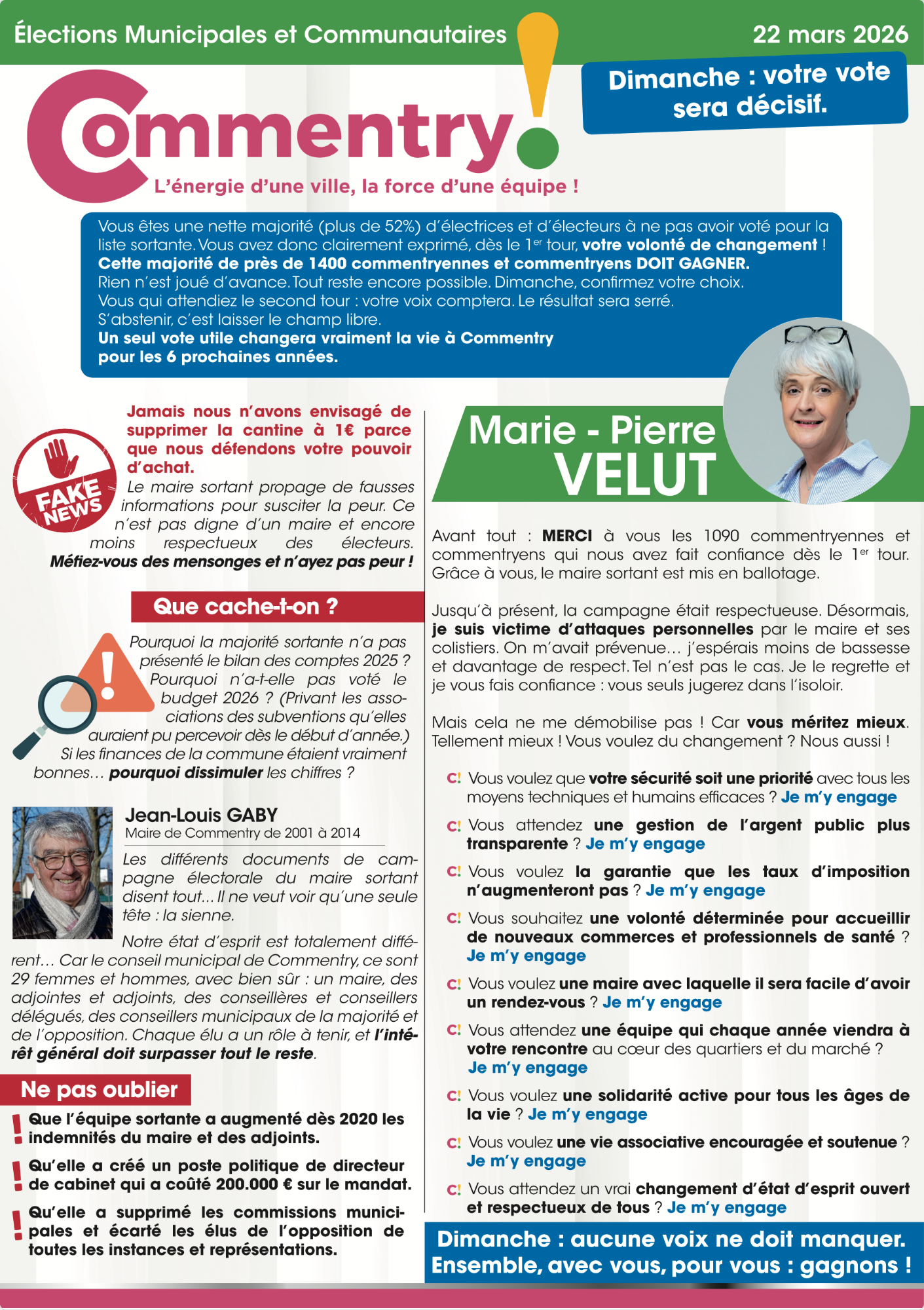 Nos propositions concrètes et mesurables pour la sécurité, le cadre et la qualité de vie, l'action sociale et solidaire, l'école, les commerces et le coeur de ville, la culture, le sport, l’environnement, la jeunesse, les seniors, le soutien aux entreprises... Un programme réaliste élaboré avec et pour les Commentryens à l'occasion des consultations dans les quartiers.