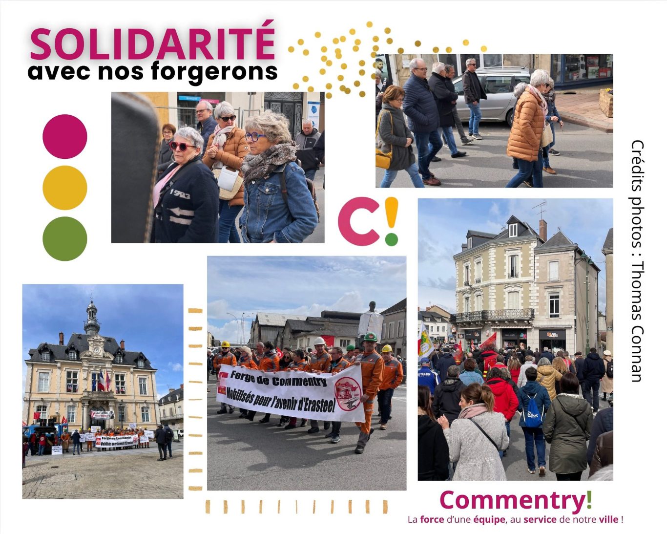 Contexte : nos élus et colistiers de "Commentry!" se sont rendus, par solidarité, à la manisfestation de soutien aux salariès d'Erasteel et leurs proches. Nous avons partagé sur nos réseaux des photos de Thomas, accompagnées d'un texte de soutien. Cependant, nous avons volontairement effacé les drapeaux d'une organisation syndicale qui monopolise et vampirise l'évènement. Nous ne faisons pas allégence à ladite organisation, nous sommes solidaires de nos forgerons. Tout simplement ! En réaction, le délégué départemental dudit syndicat s'est fendu d'un post haineux et totalement indécent à l'encontre de nos élus.